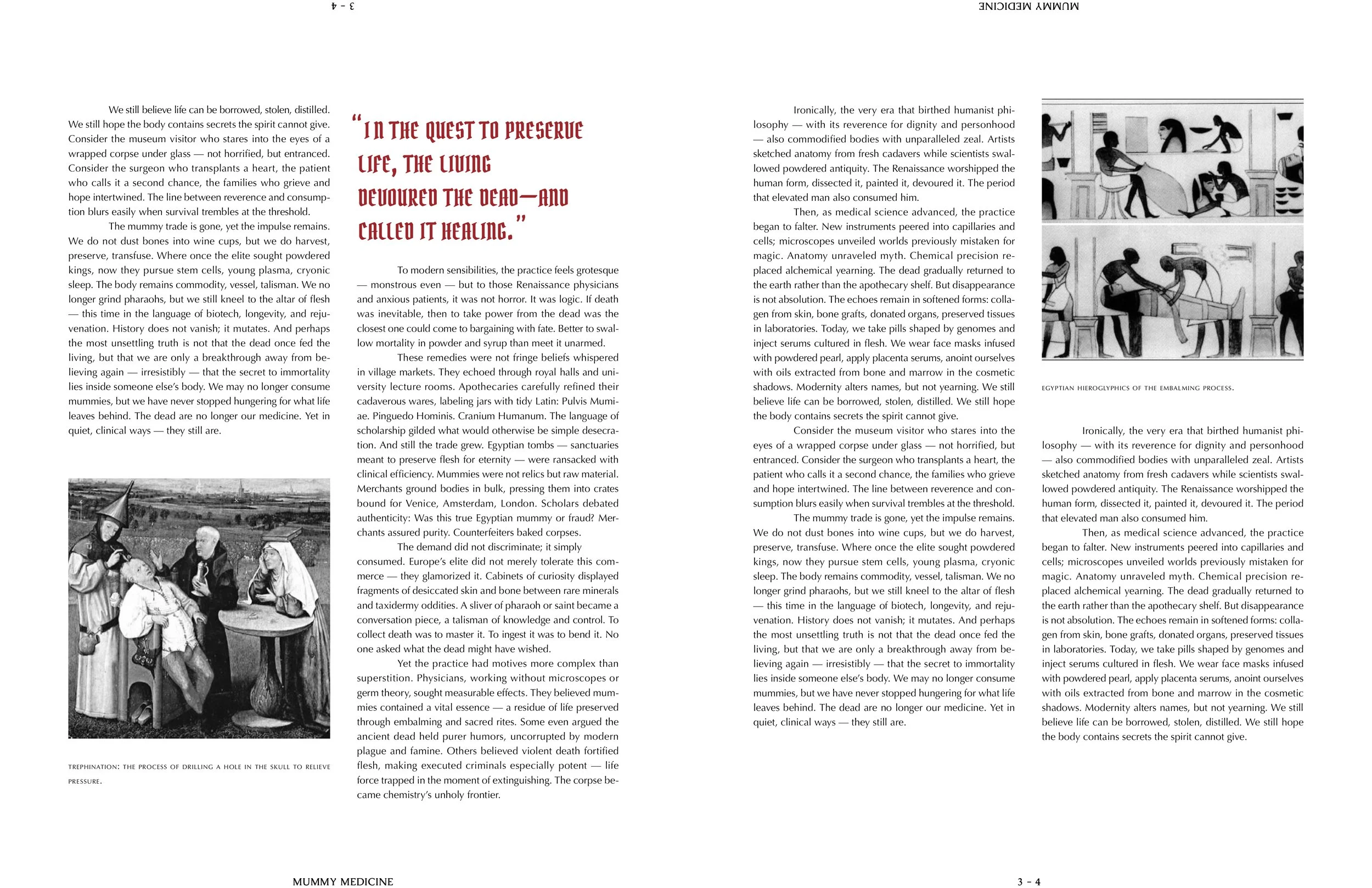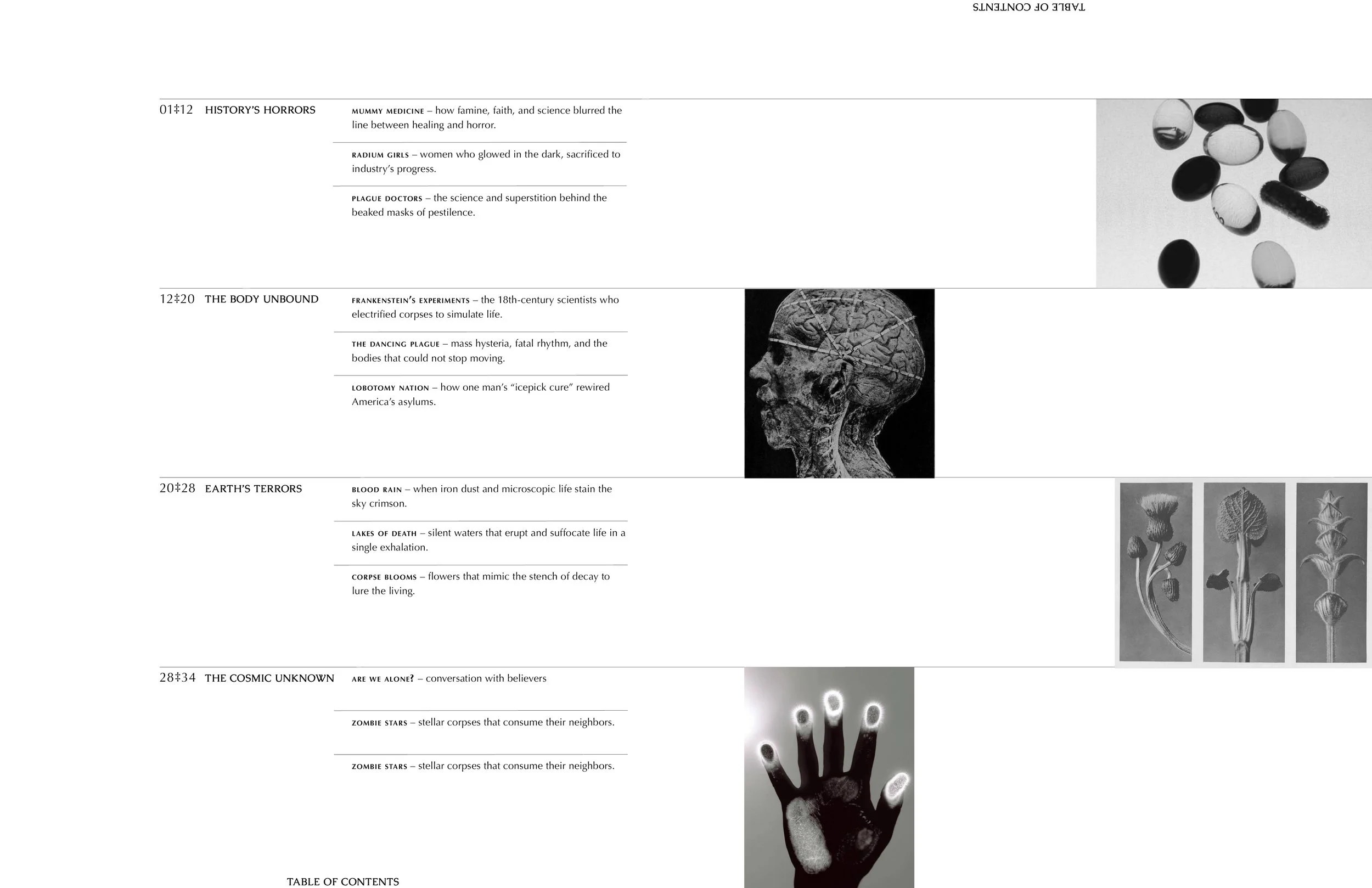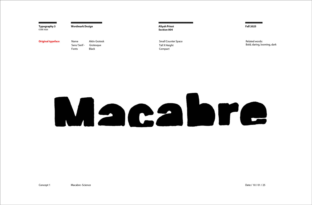 This assignment was to make a word-mark, set of design rules, and a visual system for a publication of our own creation. I created Macabre, a non-fiction science publication centered around the grotesque and horror like aspects of science. My goal was to create a publication that felt academic while also being off putting and ominous.