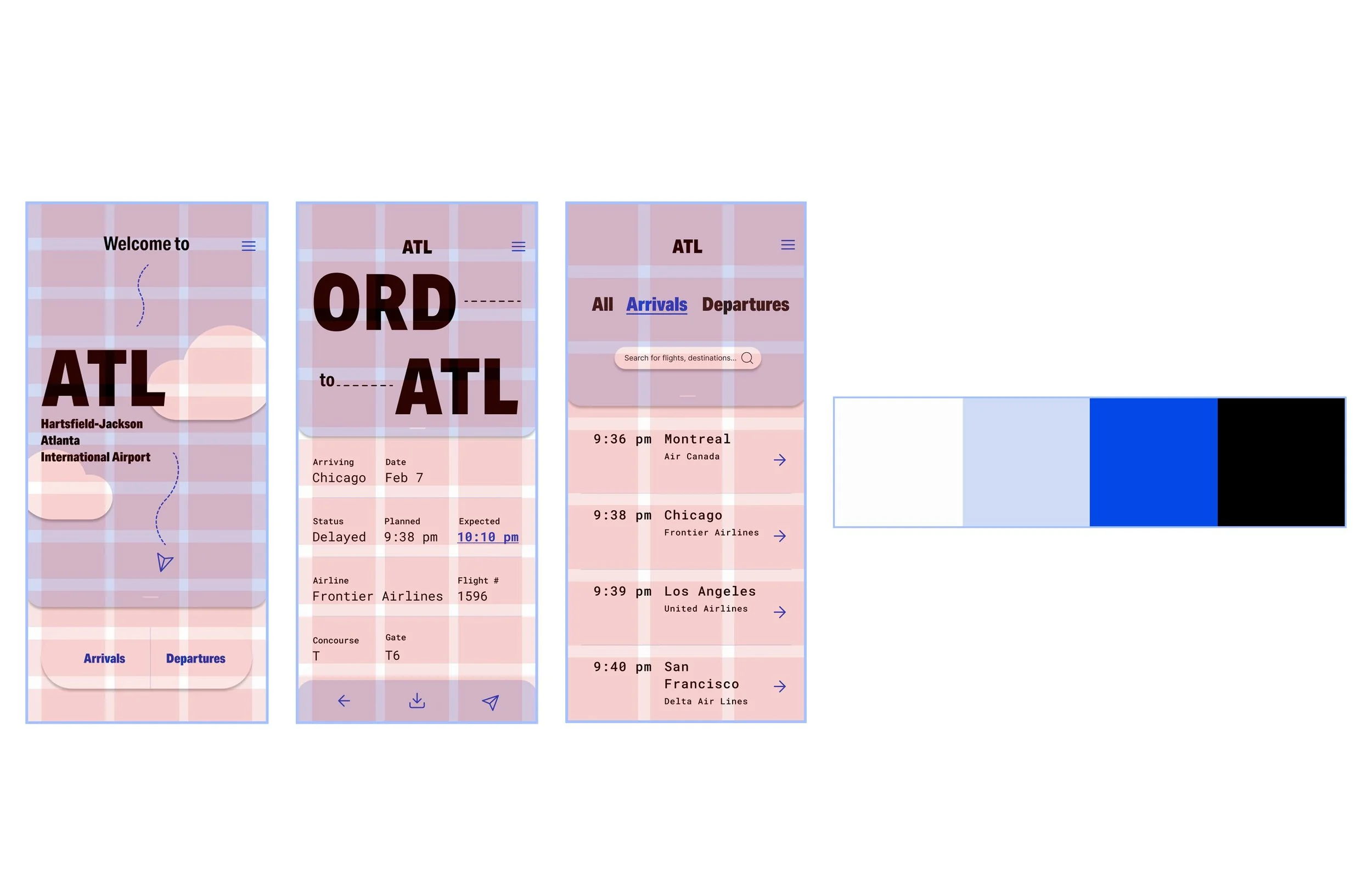 I continued critiquing the organization of information and applying a color scheme. I wanted to keep the color palette simple and calming. I tried using a monochrome with whites and blacks with use of color only for specific flight information. I felt it was not enough for a brand identity system so I decided on white, black, and a selection of blues.